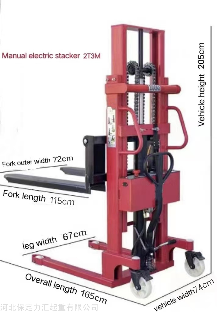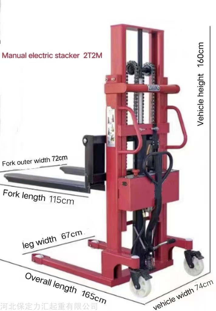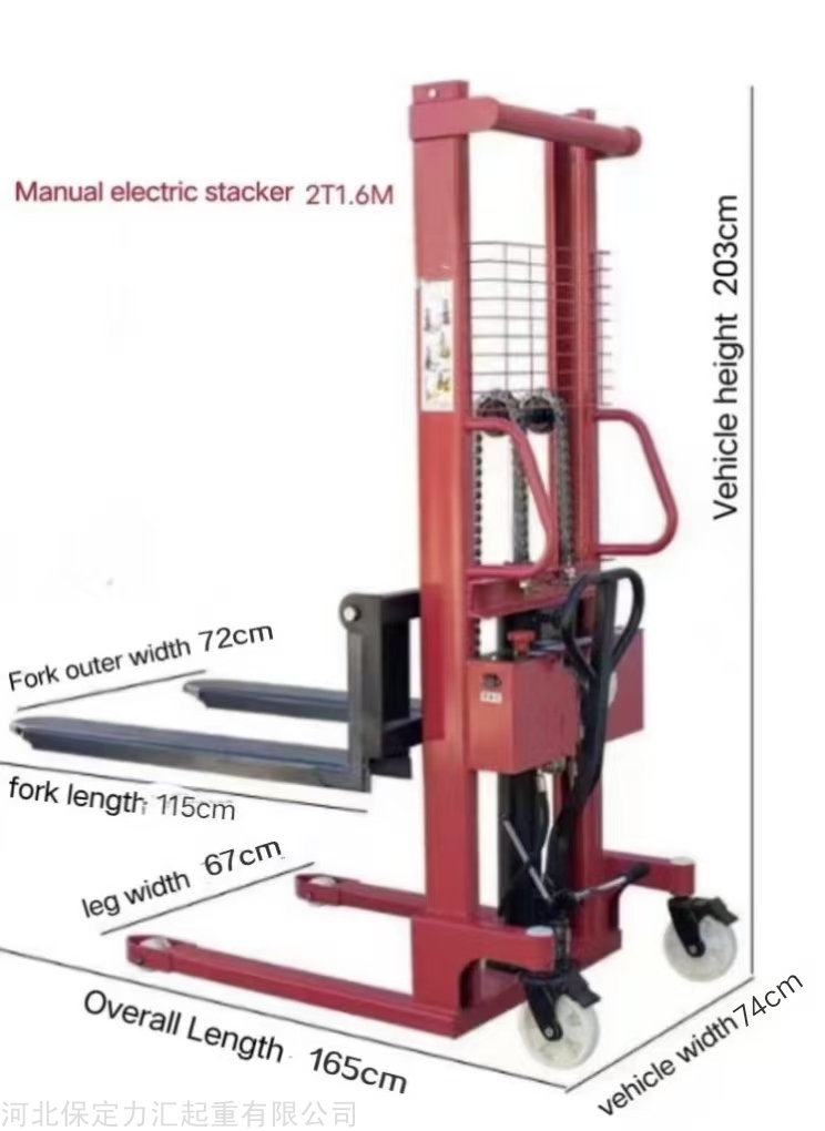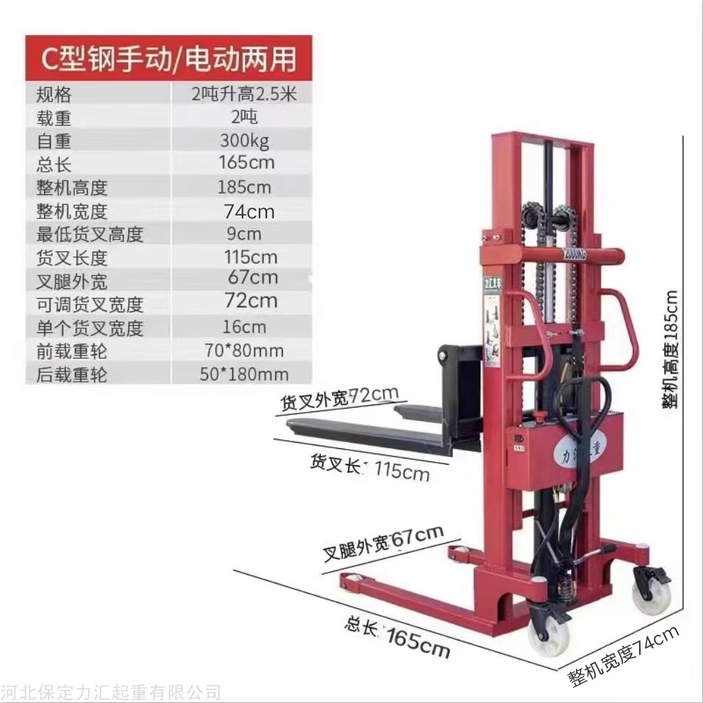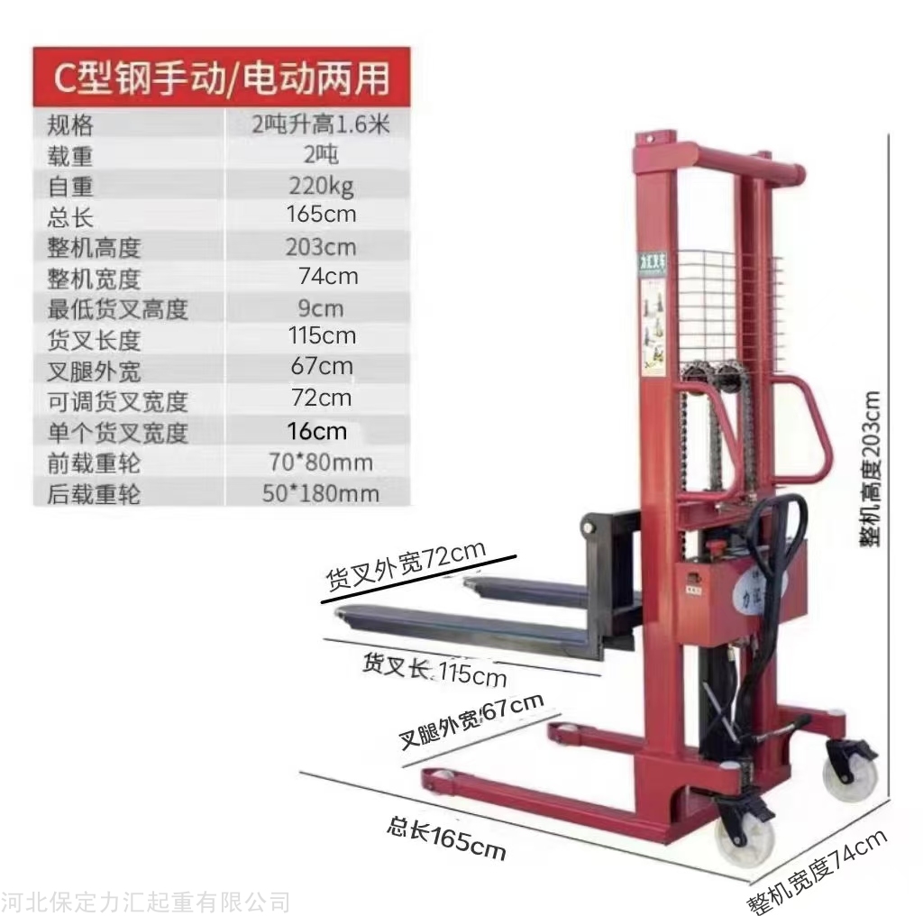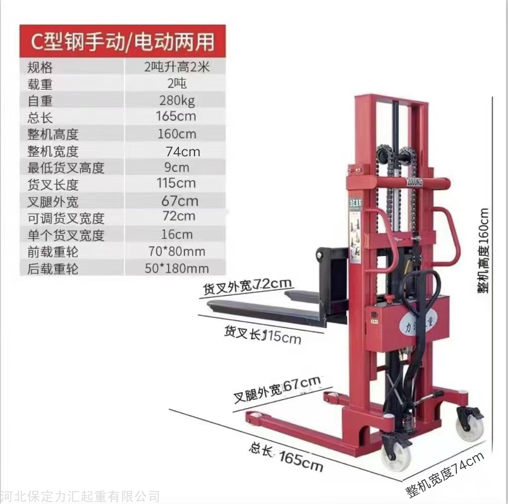 手电两堆高车,可以手动起升也可以电动起升的堆高车,整车采用国标加厚钢材,实心轴活塞杆油缸,进口密封圈,漏油机率低,承重能力强,天能免维护电瓶,使用寿命长。规格分为;1吨1.6米,2吨1.6米,2吨2米,2吨2.5米,2吨3米。支持定制异型尺寸。插头可根据客户使用进行匹配。CE证书齐全。