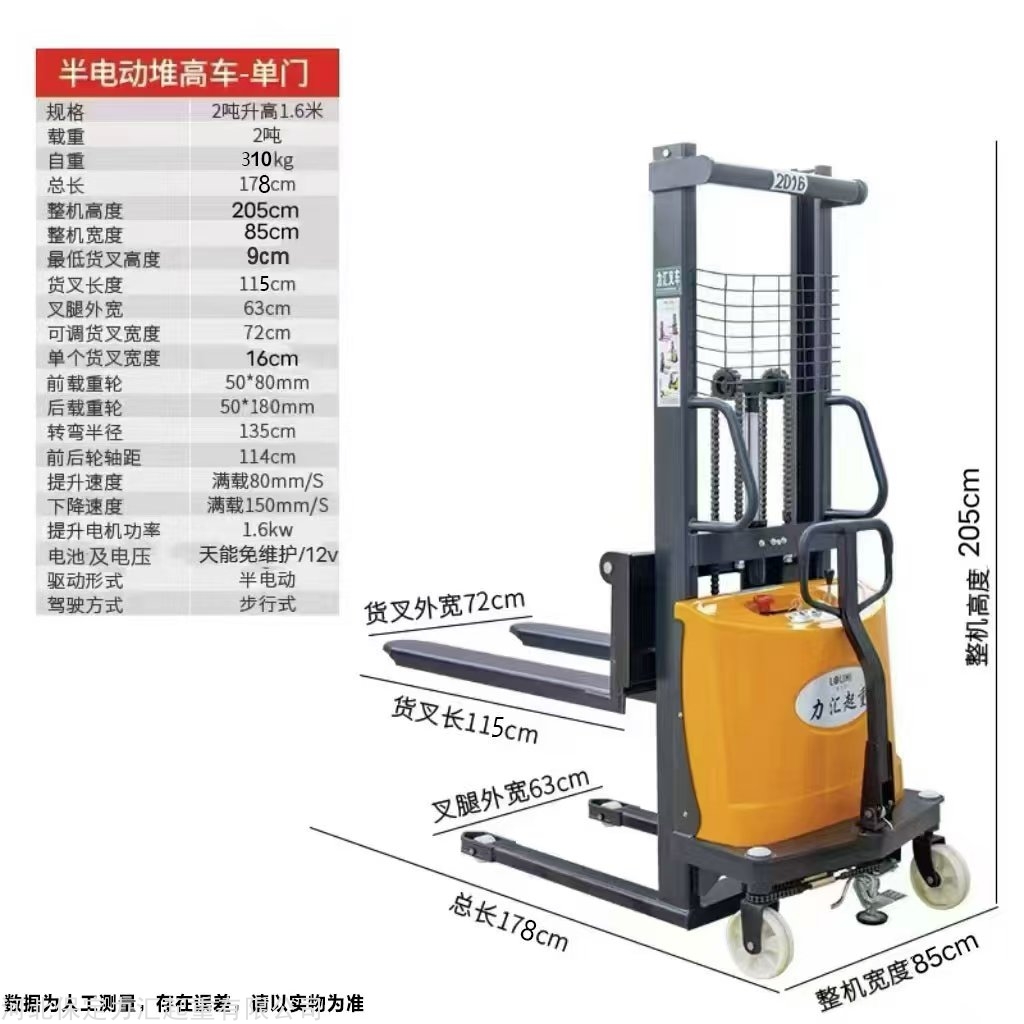 本车是一款以电瓶为动力,电动升降,手动行走的经济型电动叉车。整体外观精美,操控灵活方便。节能环保,性价比高,广泛应用于工厂,车间,仓库,物流中心,港口,码头,车站,机场等需要装卸货的场所,并且可以进入集装箱操作,可根据客户定制异性尺寸,以满足不同的场景需求。(充电电压220V/110V可选插头可根据客户使用进行匹配。