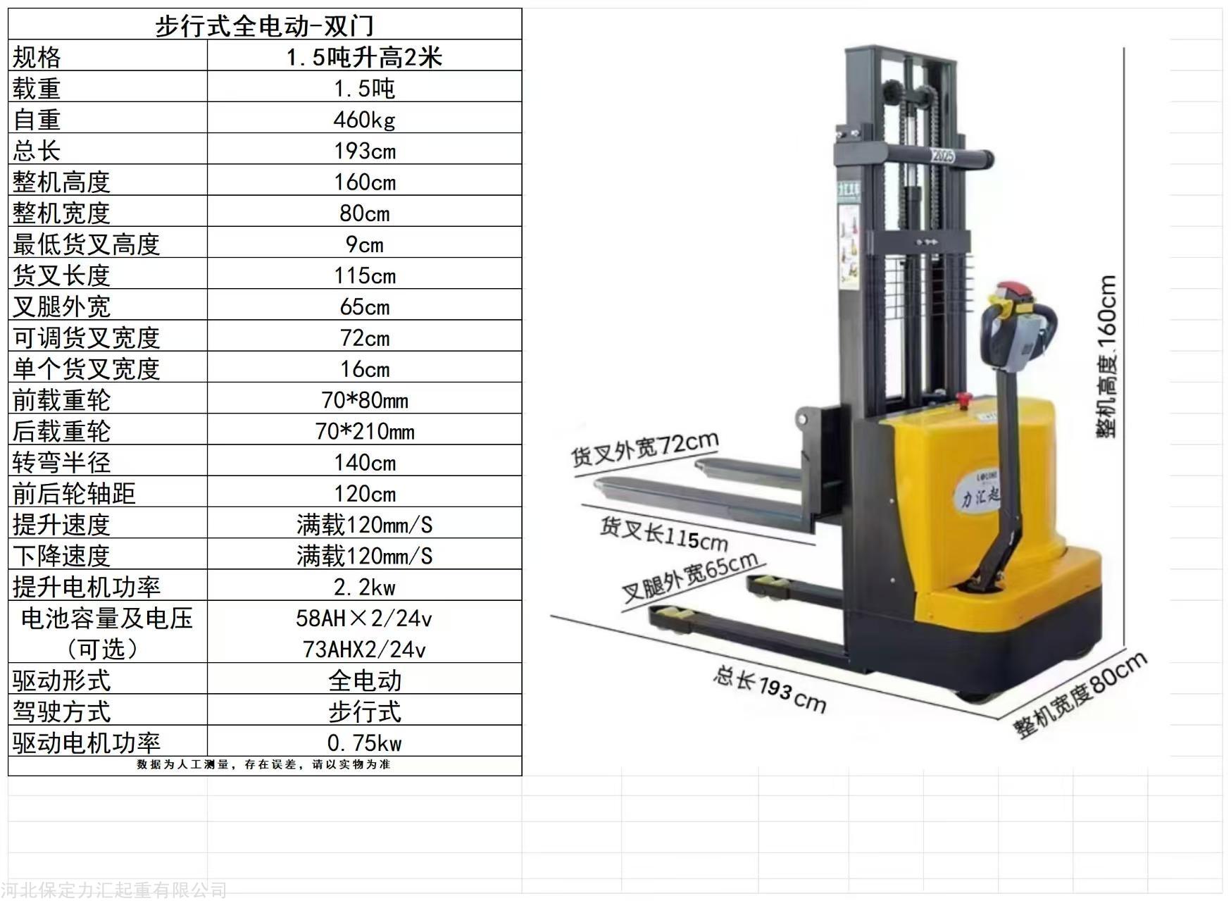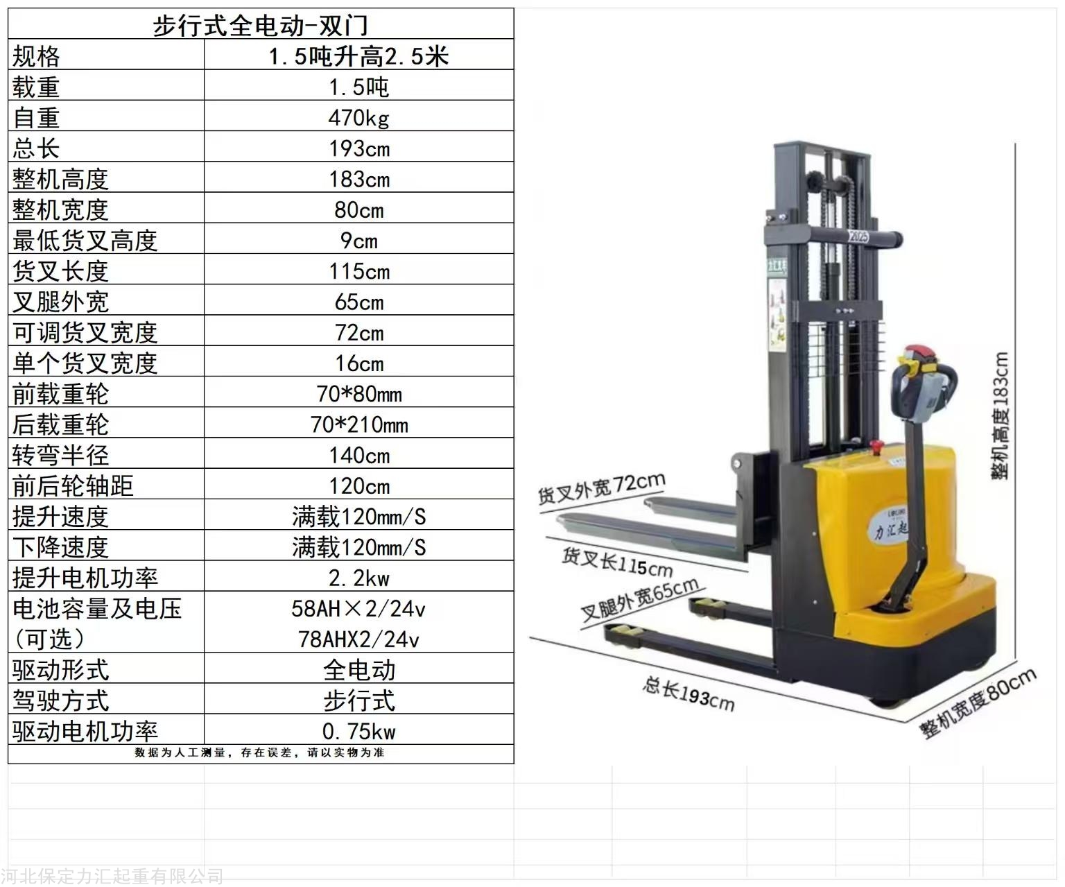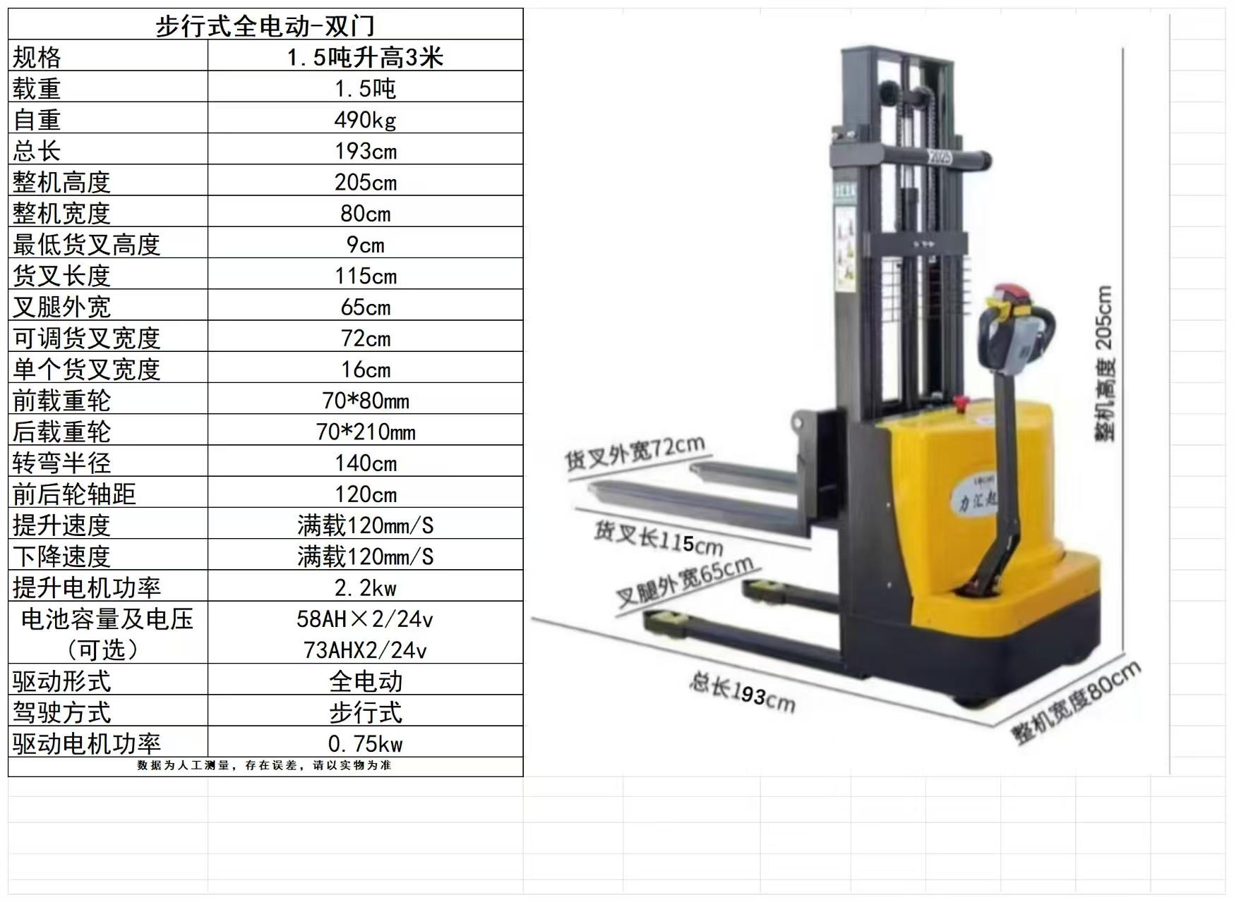 步行式全电动堆高车,最大额定载荷为1500kg。整体外观精美、操作灵活方便、经济实用、节能环保、性价比高,适合低频率、低强度、短距离的搬运和堆垛工况,能满足多数企业用户的货物搬运堆垛需求。(充电电压220V/110V可选)插头可根据客户使用进行匹配。