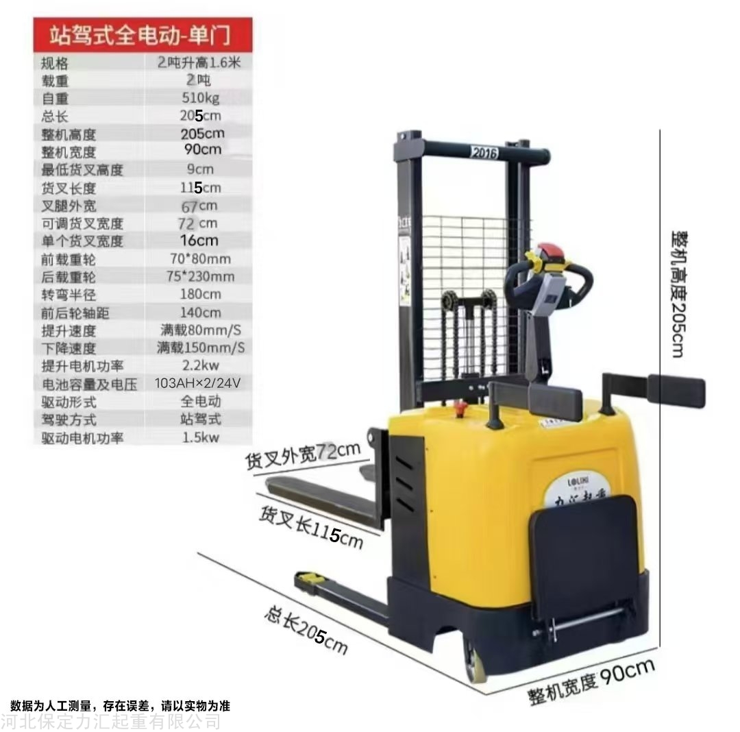 电动堆高机又称托盘堆垛车,是一种以电瓶为动力来源电动升降、电动行走全电动工业仓储设备。其主要功能是搭配托盘进行物品的堆高、卸货、搬运等操作,是现代的工作、车间、仓库所必备的一种工业车辆。电动堆高机广泛应用于工厂、车间、仓库、流通中心和配送中心、港口、码头、车站、机场等需要物流的场所,并且可以进入集装箱、仓库内进行操作。(充电电压220V/110V可选)插头可根据客户使用进行匹配。